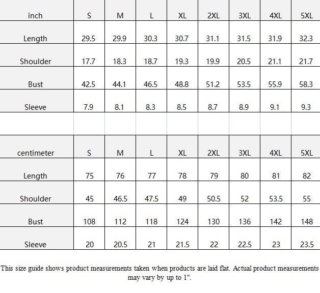 | inch | S | M | L | XL | 2XL | 3XL | 4XL | 5XL |