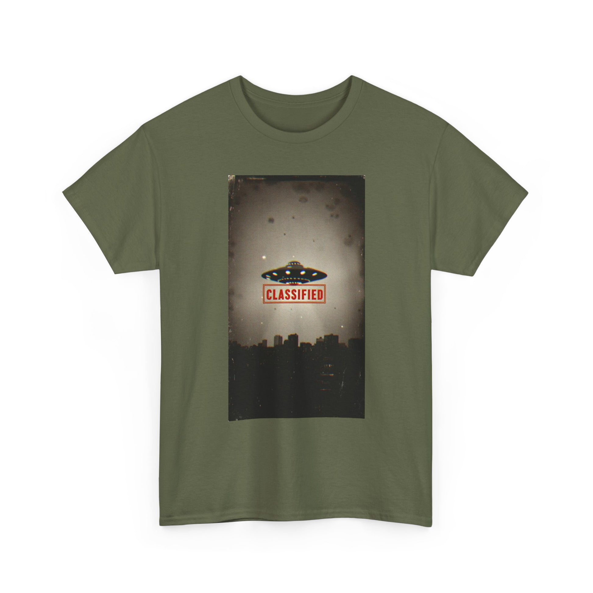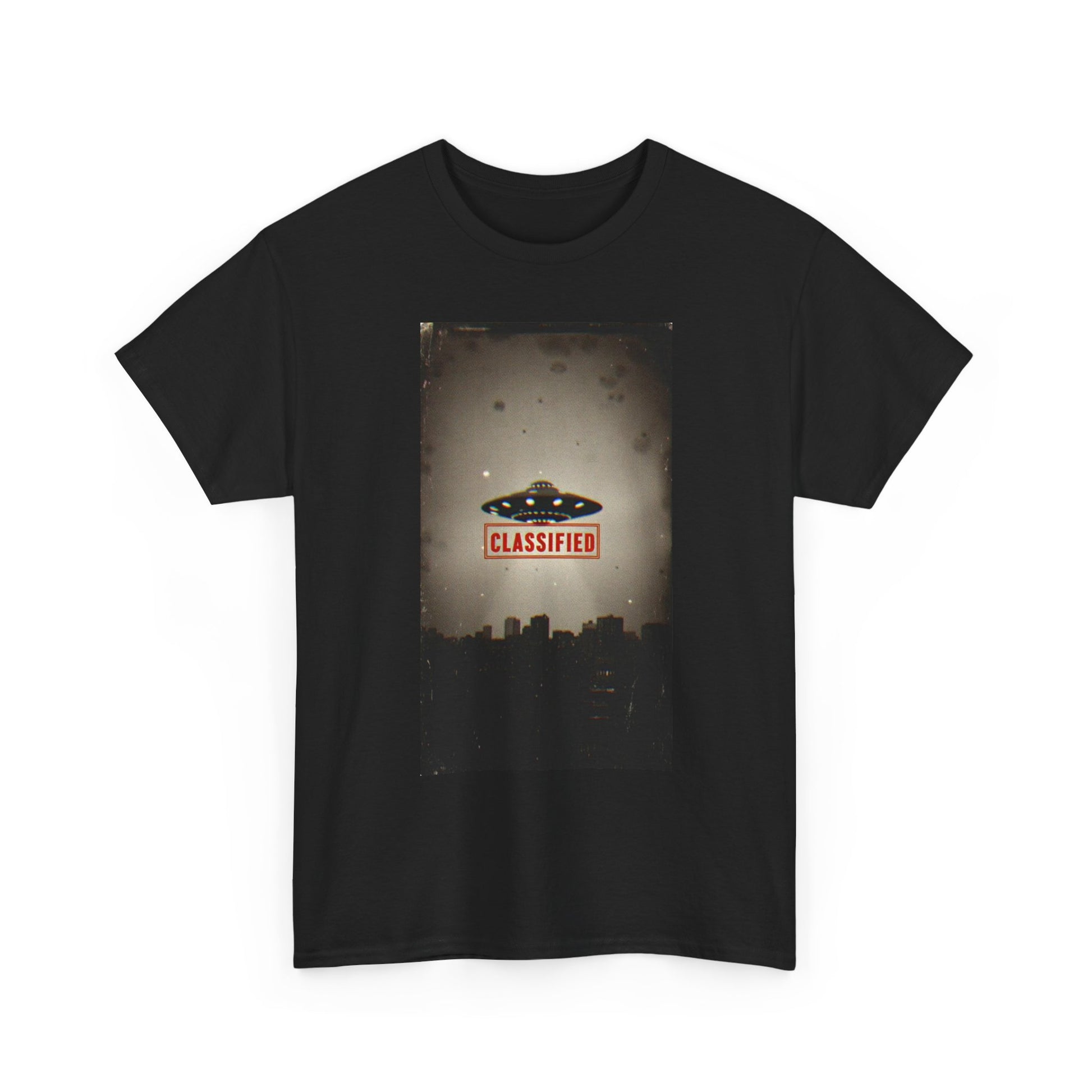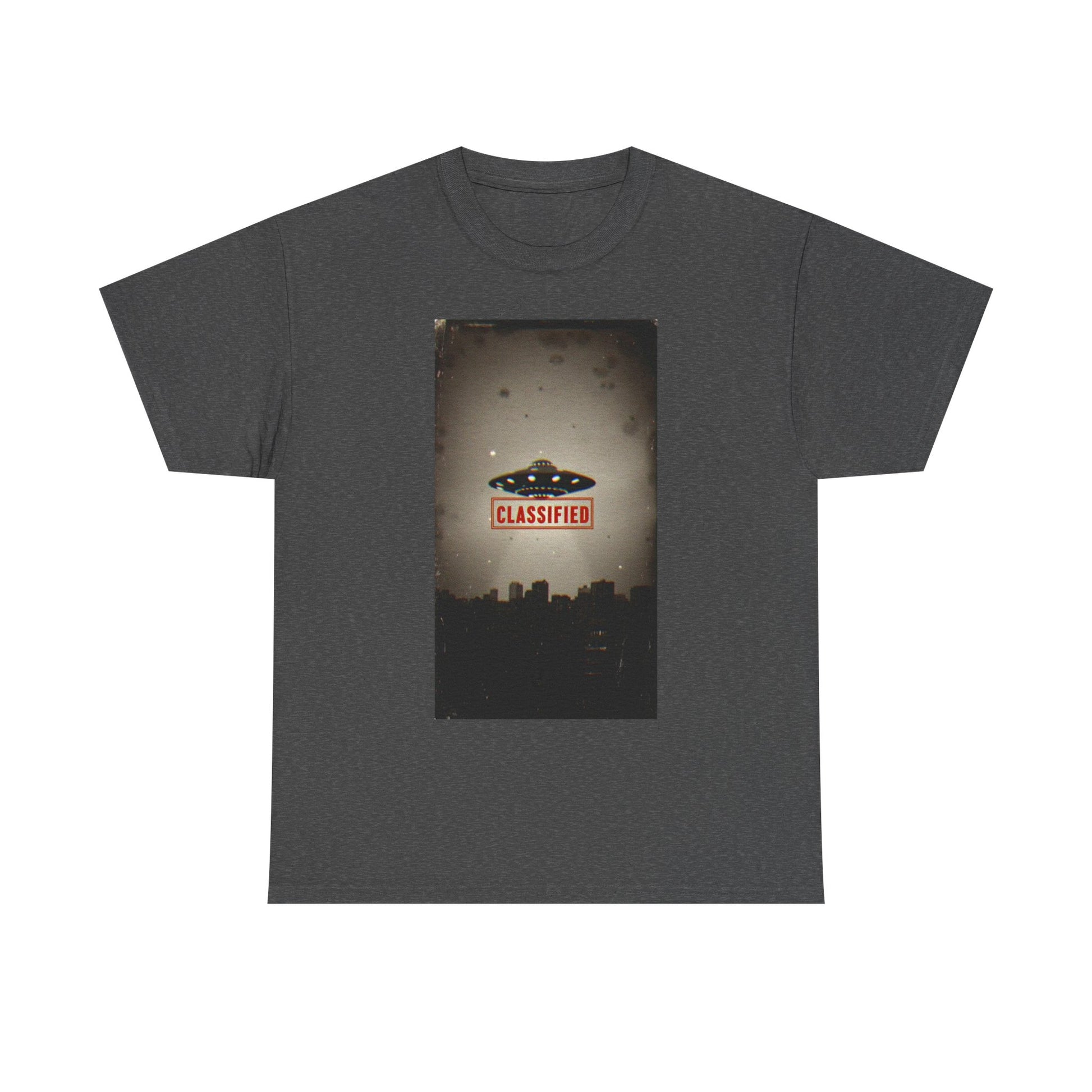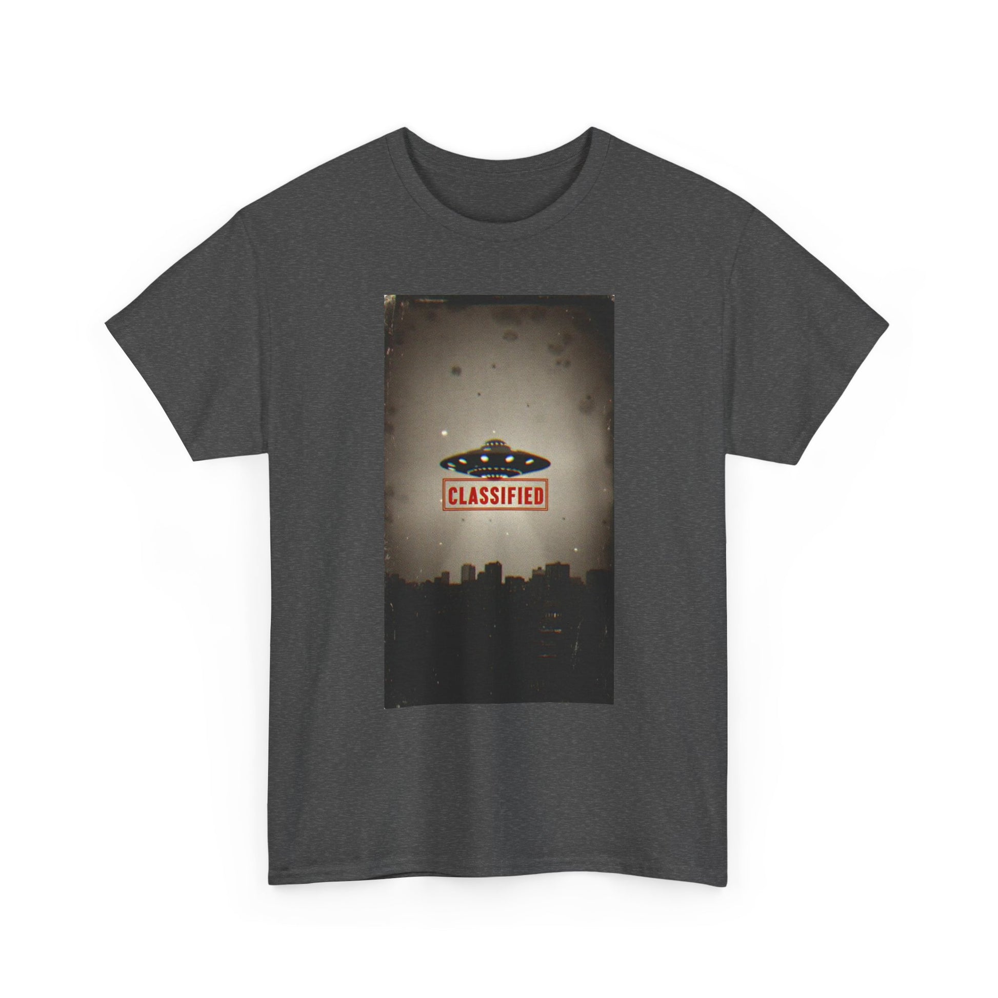 Classified UFO --Unisex Heavy Cotton Tee, Alien Graphic Tee, Sci-Fi Shirt, Gift for UFO Lovers, Casual Wear, Halloween Costume