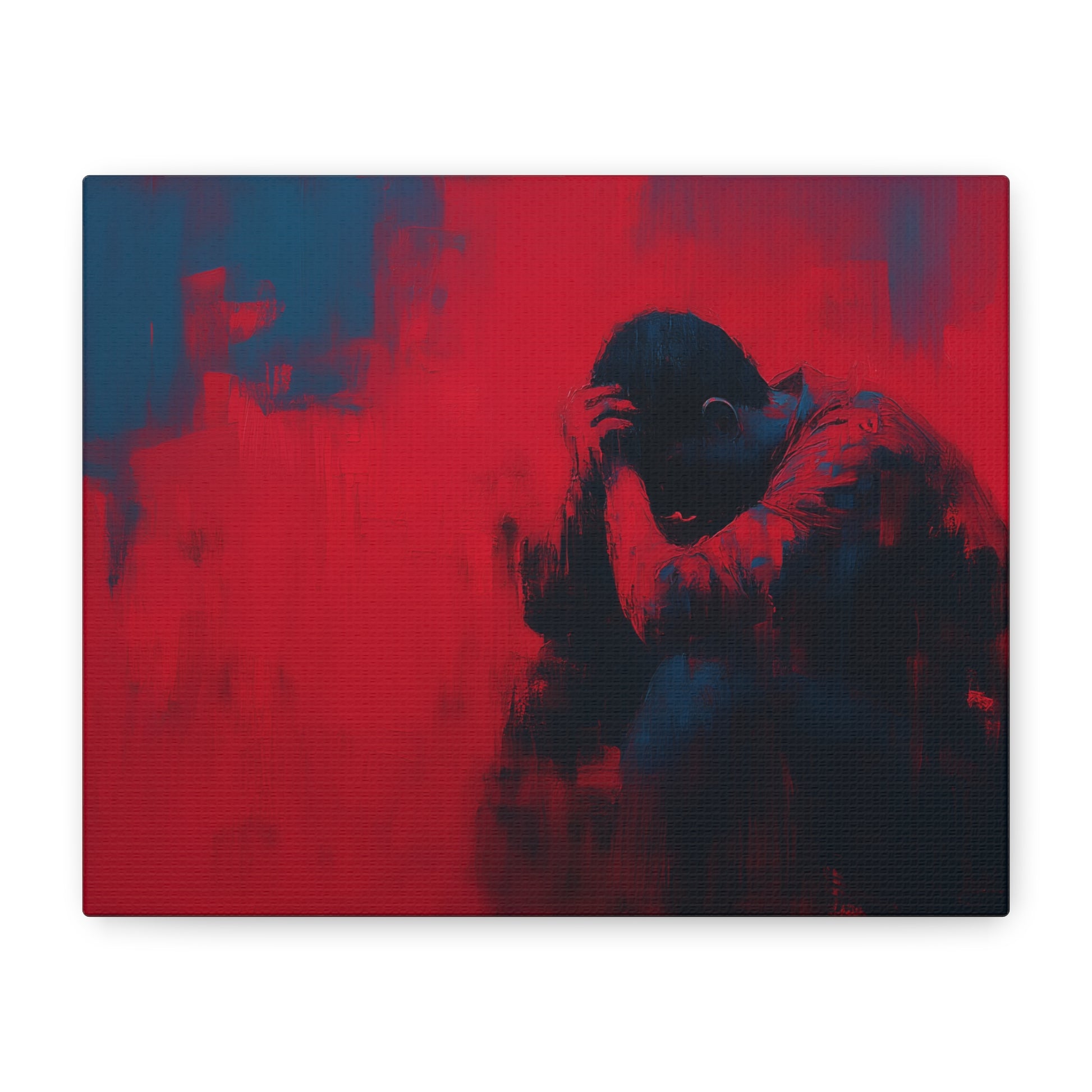 A raw meditation on isolation and inner struggle, this semi-abstract work captures the weight of emotion in a single bowed figure. Cloaked in deep blues and blacks, the subject folds inward—hands clutching the head, posture heavy with silence. The surrounding canvas burns in vivid red, a backdrop that feels both confrontational and cathartic.