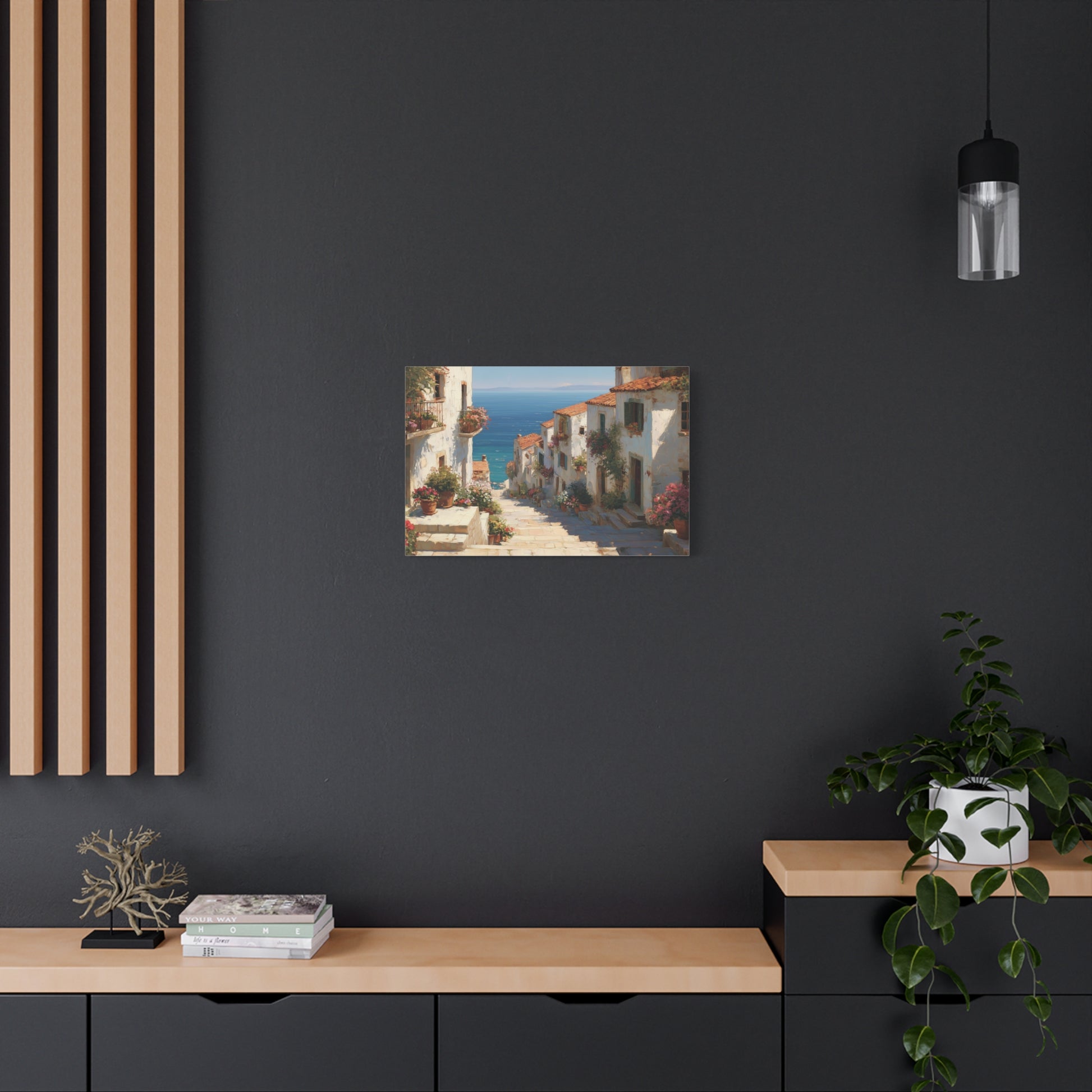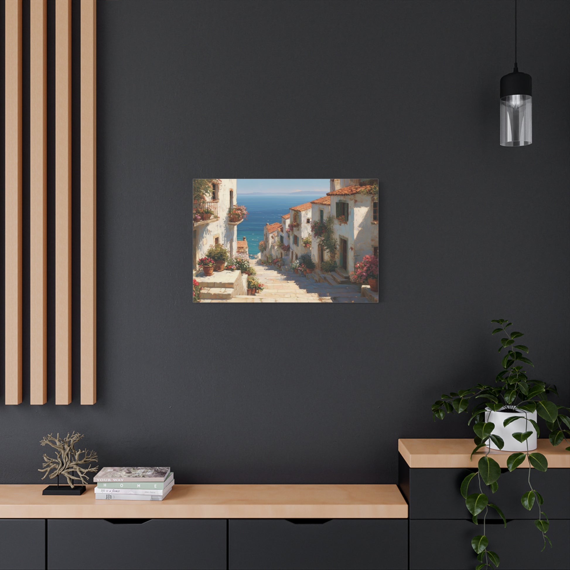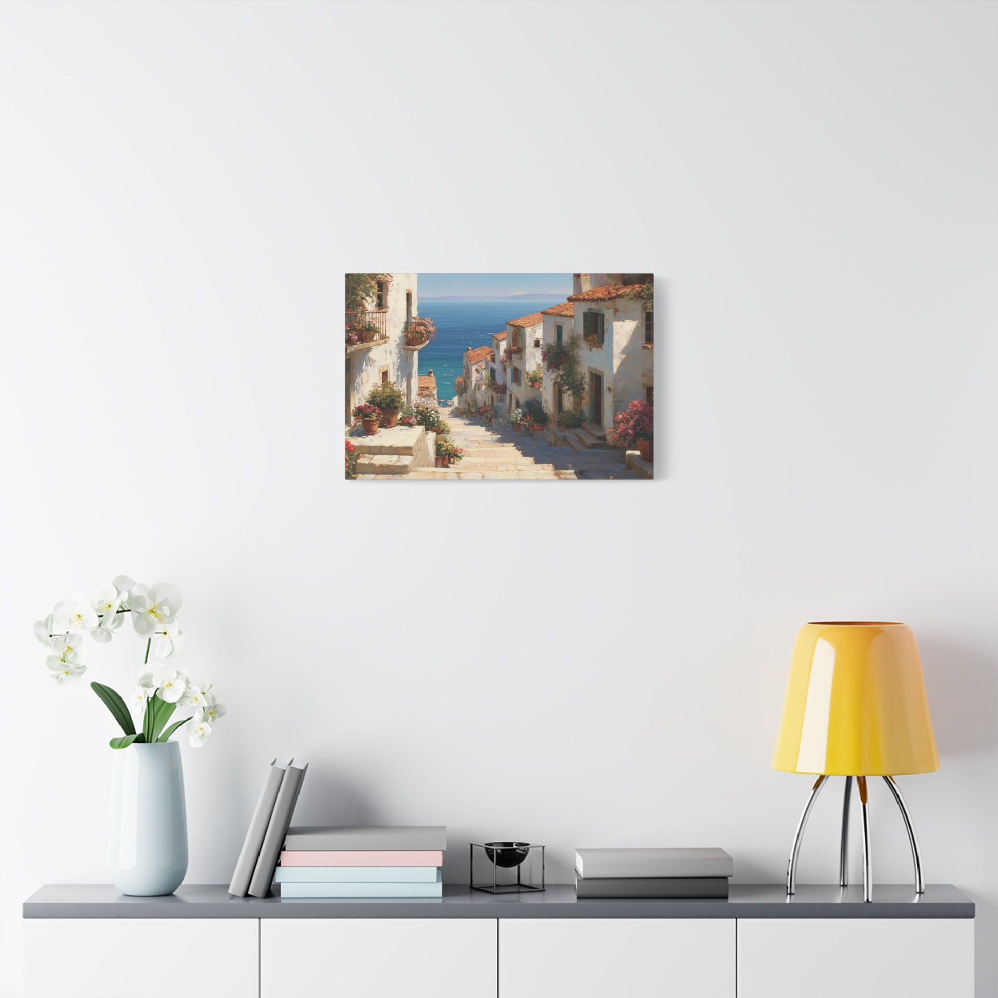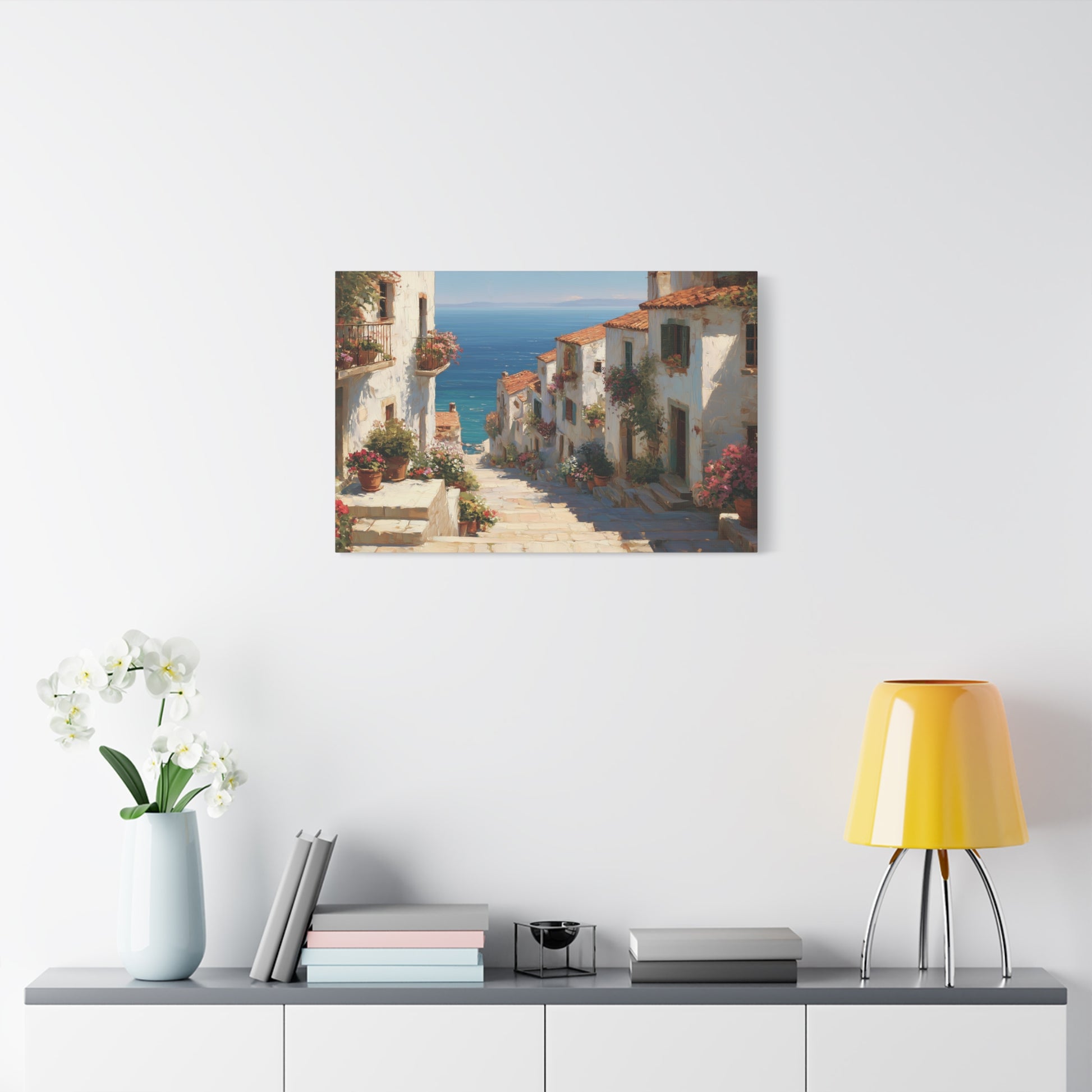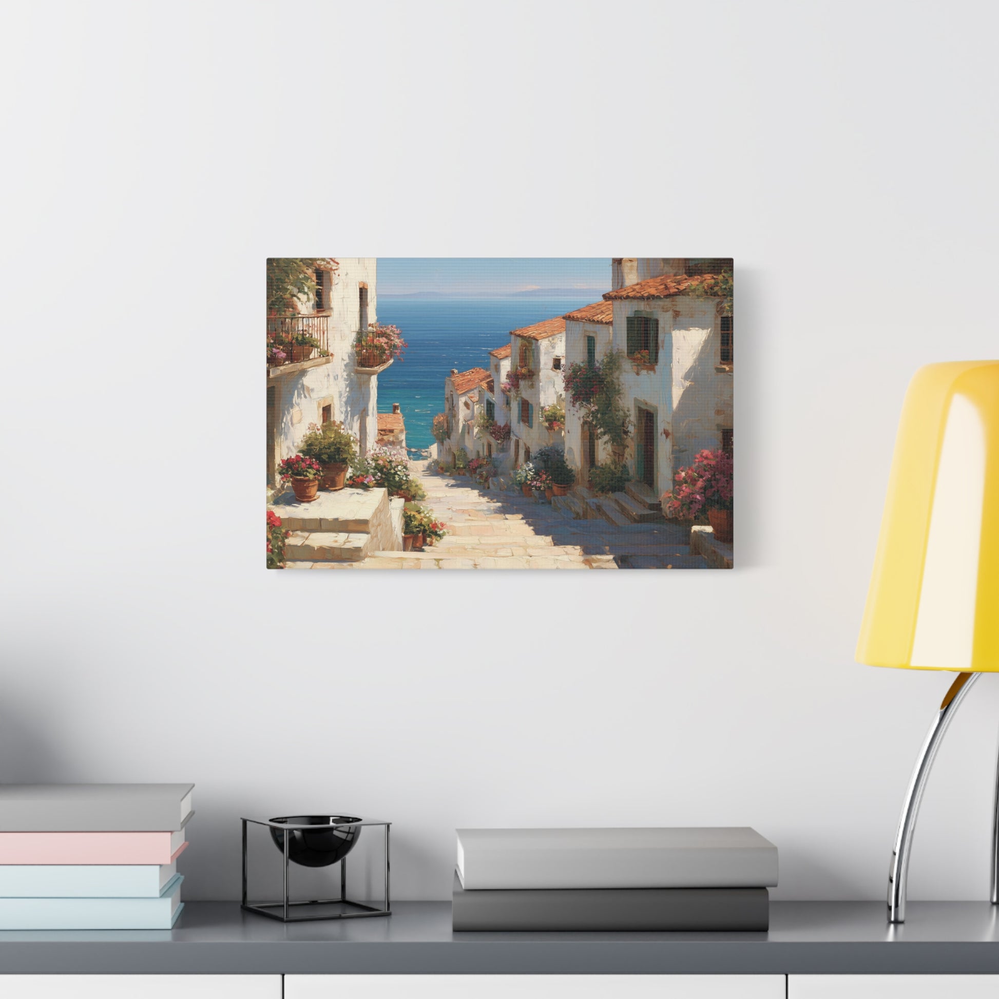 Introducing the "Mediterranean Afternoon" art print! This captivating painting depicts a charming hillside village with whitewashed houses, terracotta roofs, and vibrant flower-lined steps leading to a stunning blue sea. Ideal for infusing your home with a touch of Mediterranean serenity. Available in various sizes.