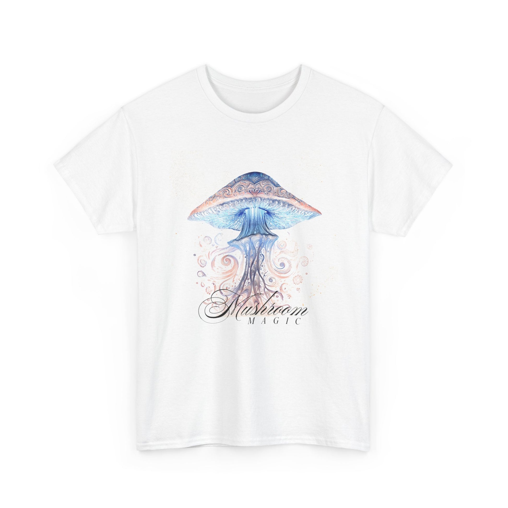 Light, airy, and quietly psychedelic — this cotton tee carries a painterly mushroom illustration that feels like a stroll through a mossy grove at dawn. Soft blues and warm accents swirl around a delicate cap and drifting gills, with flowing script beneath that gives the design a vintage botanical vibe. Wear it on slow mornings, at small gatherings, or layered under a jacket for evenings when you want something gentle but expressive. The breathable fabric and relaxed cut let the artwork sit naturally on the chest while you move, so the shirt becomes part of the moment rather than shouting for attention.