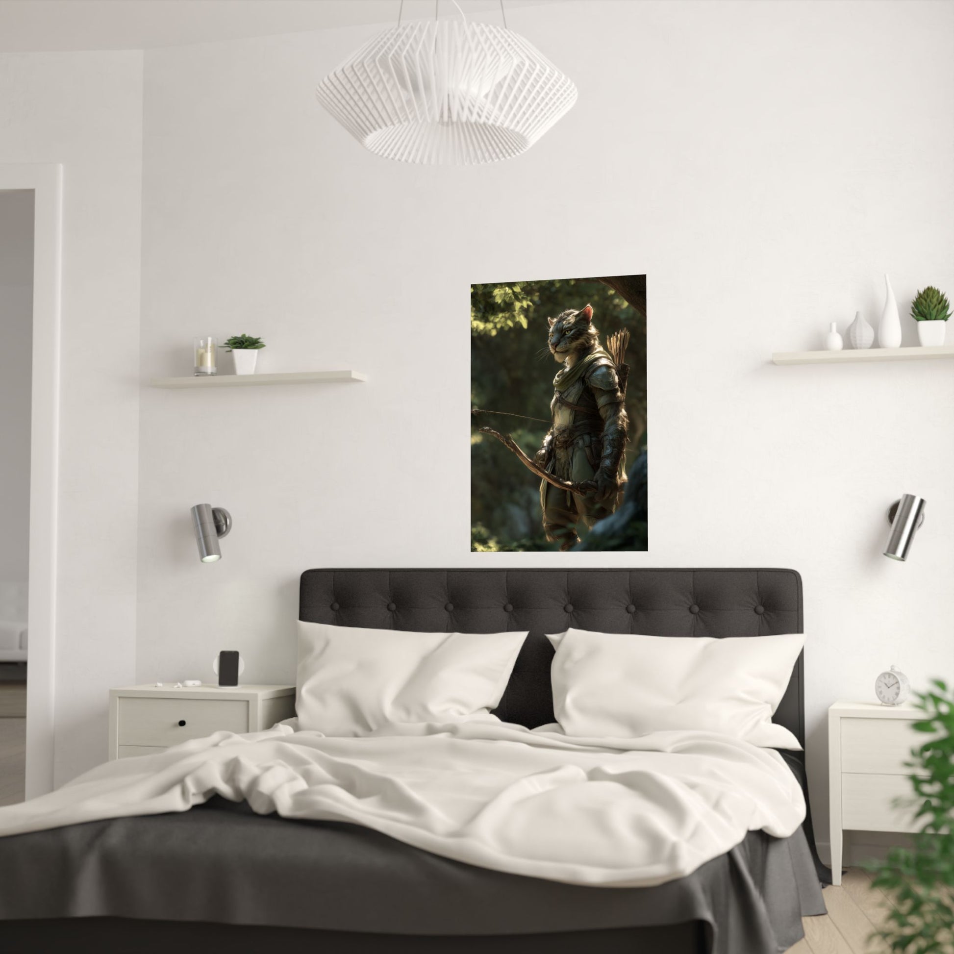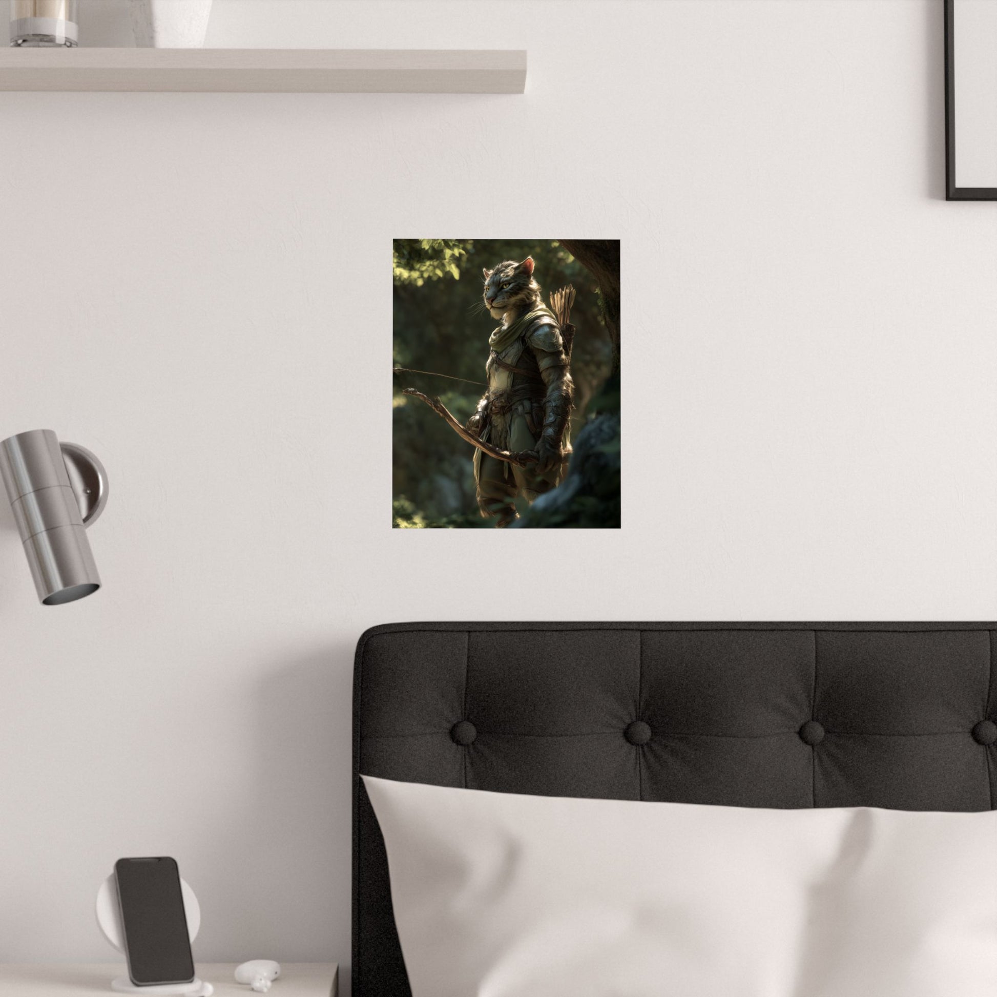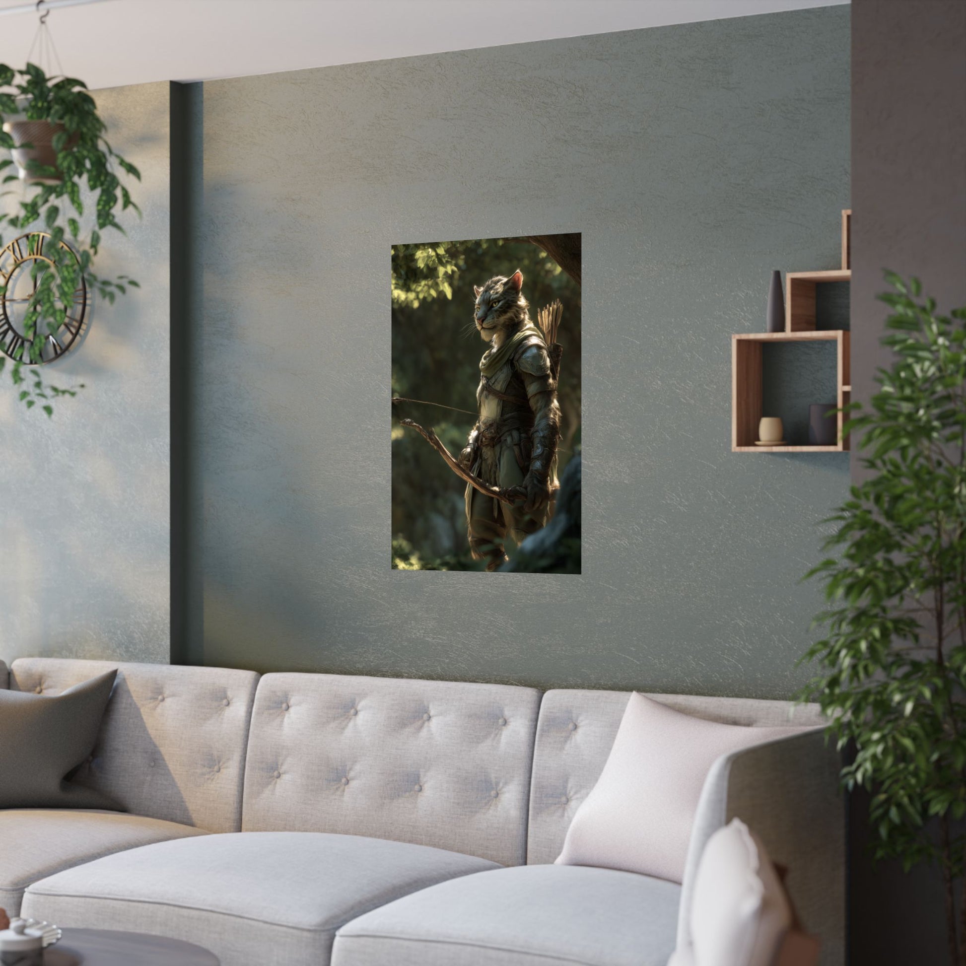 An evocative satin poster that brings a fantasy Tabaxi Ranger woodland scene to life. Rich, pigment-ink colors and a low-glare satin finish give depth to the archer-cat figure standing in dappled forest light. The museum-grade paper keeps tones vivid and archival, while multiple sizes and orientation options let you place this piece above a desk, in a game room, or as part of a gallery wall. It feels like a doorway to a quiet, watchful story — a piece that draws viewers into a world of stealthy guardianship and twilight hunts.
